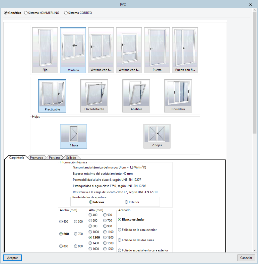 - Tipo de apertura (Fija / Practicable / Abatible / Oscilobatiente / Deslizante)