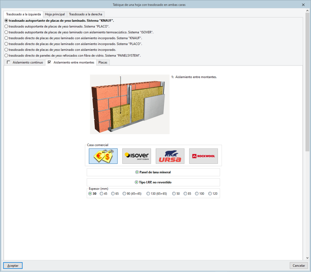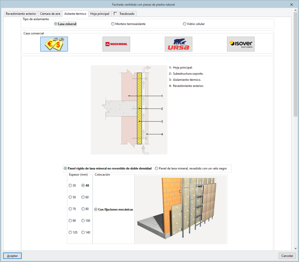El asistente a la derecha permite importar valores para ambos parámetros a partir de los datos ofrecidos por URSA, en función de la "Posición del aislamiento" ("Interior, "Intermedio" o "Exterior"), de la "Posición de la carpintería" ("Enrasada interior" o "Central") y de la "Descripción" del cerramiento.