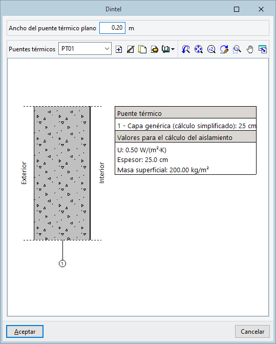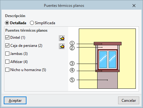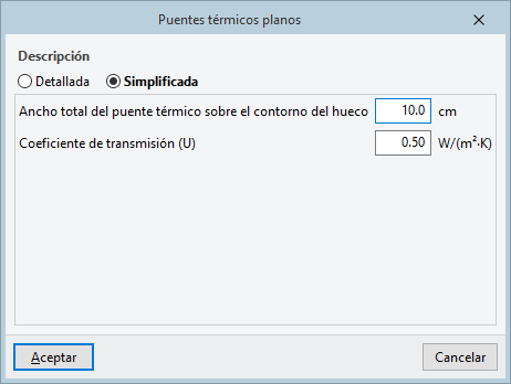 La "Descripción" de los puentes térmicos planos puede ser "Detallada" o "Simplificada". En este último caso, basta con definir los siguientes parámetros: