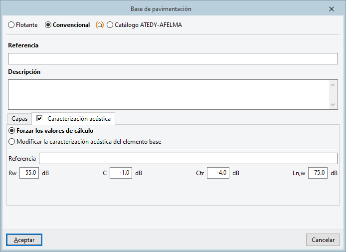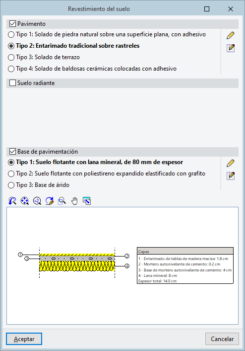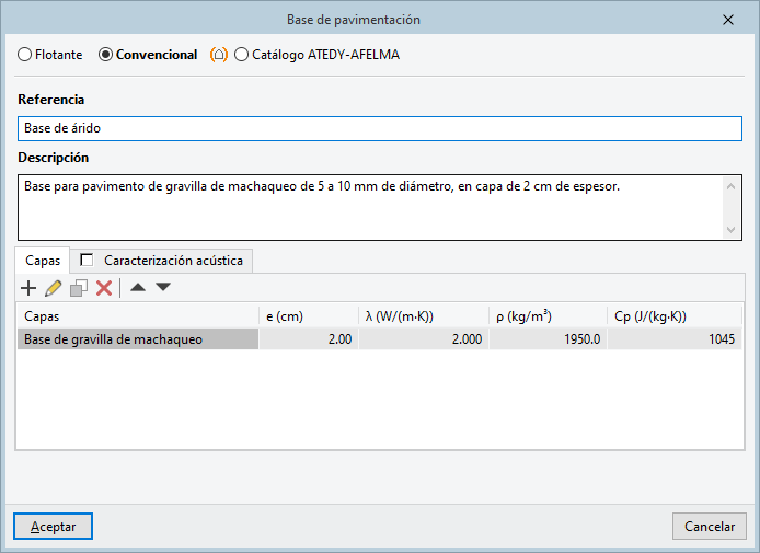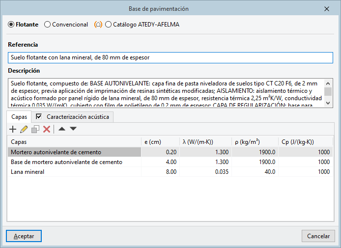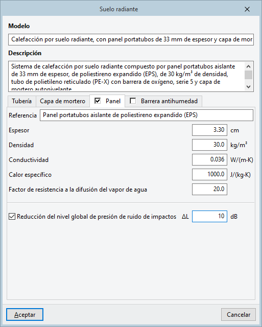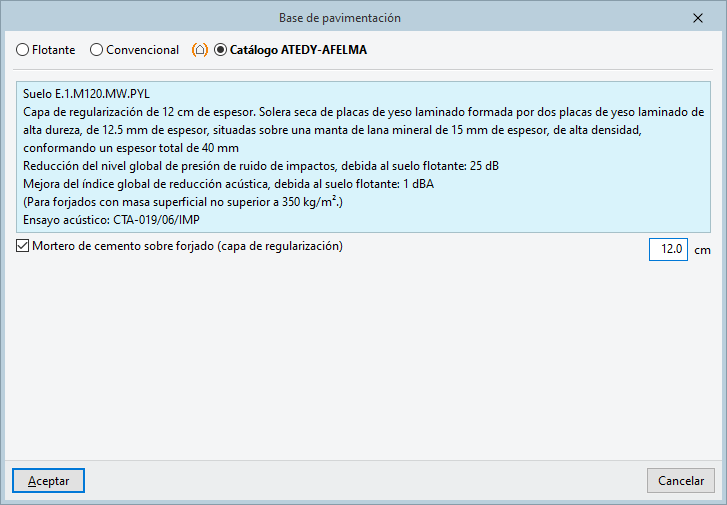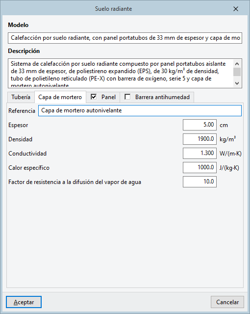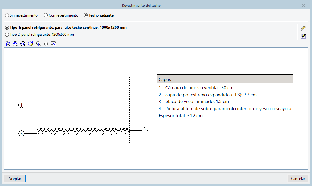 Si se marca esta opción, es necesario seleccionar un tipo de techo radiante tras editar la lista de tipos disponibles. Los tipos de techo radiante pueden obtenerse a partir del Generador de precios o definirse a partir de una introducción manual o editable.