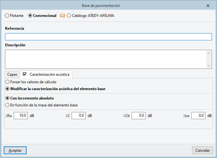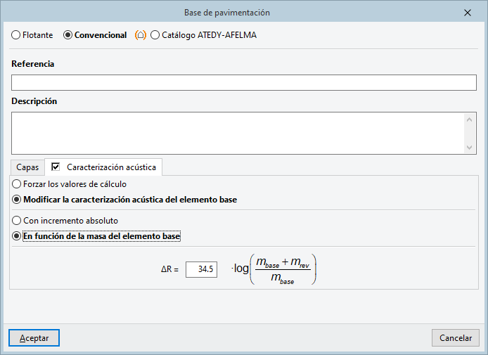 En esta tabla es posible añadir filas indicando un valor de "Incremento R" (mejora del índice de reducción acústica o mejora de aislamiento a ruido aéreo) para cada valor de la "Masa del elemento base". El programa aplicará el incremento indicado en función de la masa que tenga el elemento constructivo base horizontal donde se disponga este revestimiento. - ΔR mínimo