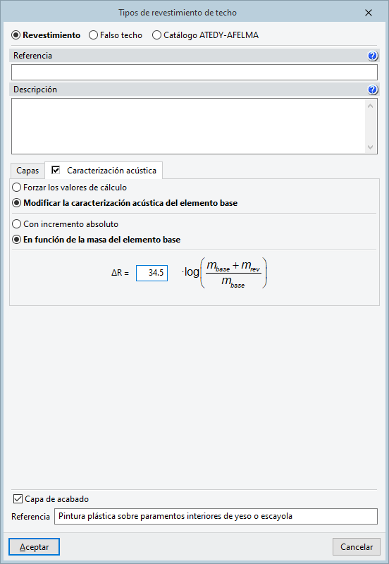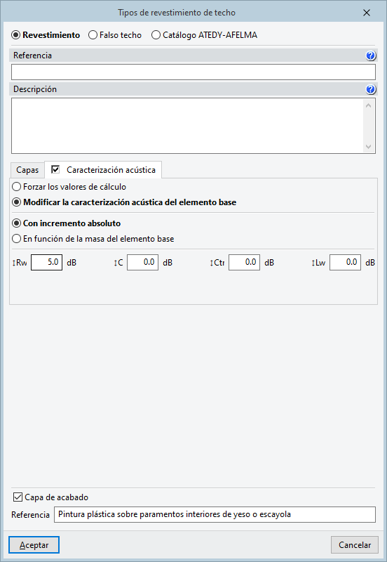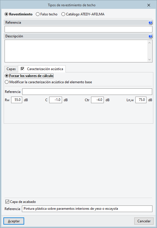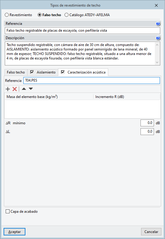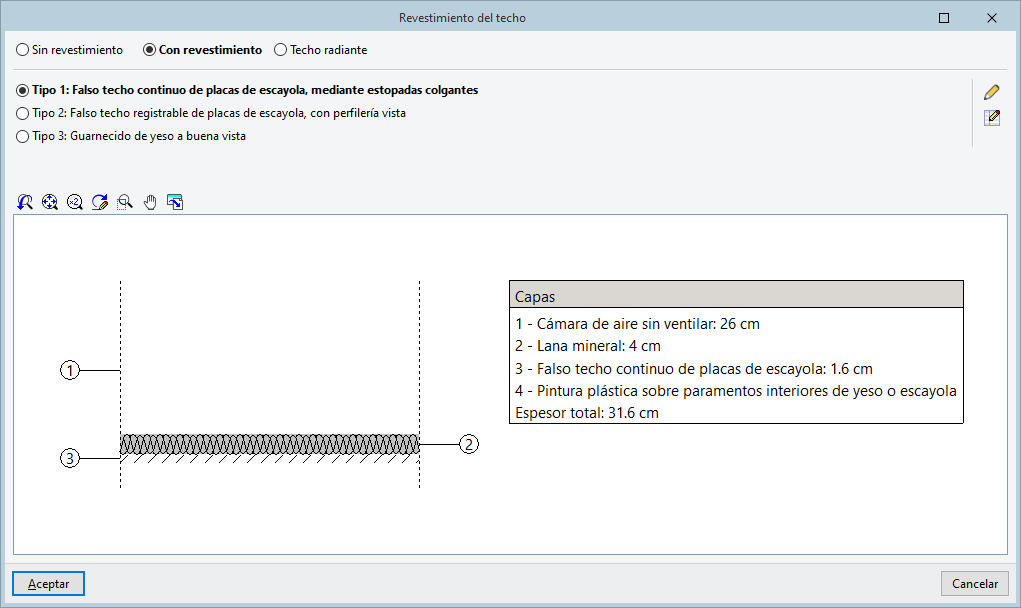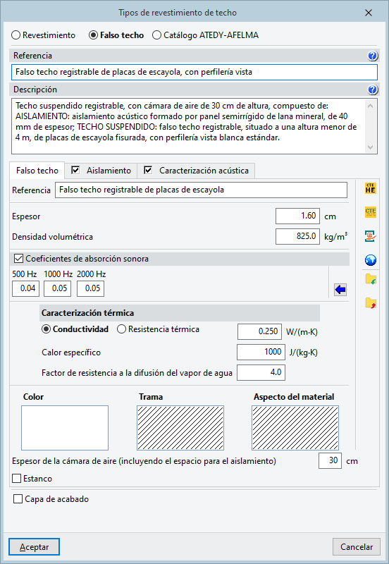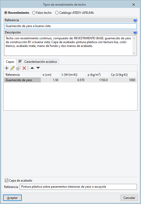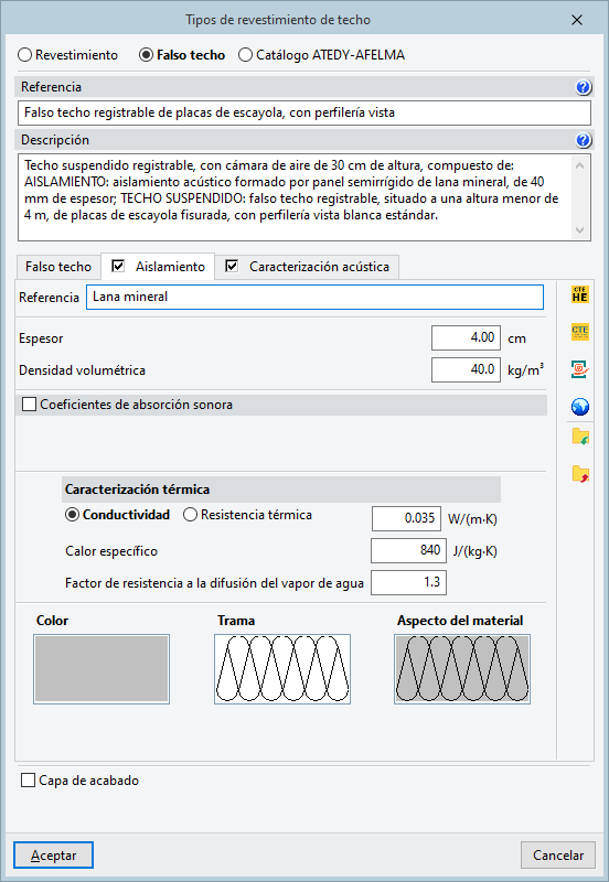 Permite introducir un revestimiento del techo a partir del catálogo de soluciones constructivas ATEDY-AFELMA (Asociación Técnica y Empresarial del Yeso, y Asociación de Fabricantes de Lanas Minerales Aislantes).