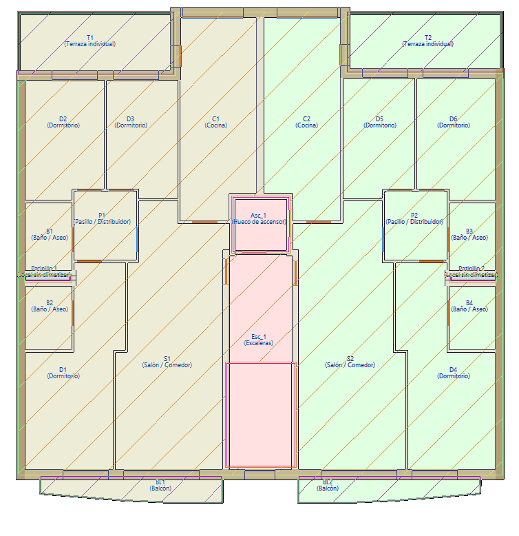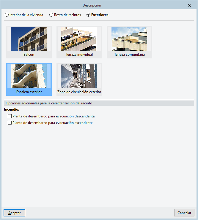 - Exteriores: Balcón, Terraza individual, Terraza comunitaria, Escalera exterior, Zona de circulación exterior.