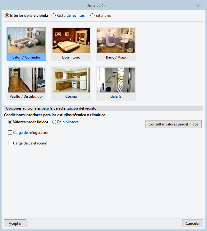 Permite mantener las condiciones interiores por defecto del recinto predefinido seleccionado. Estos valores se pueden consultar con el botón "Consultar valores predefinidos" de la parte derecha. - De biblioteca