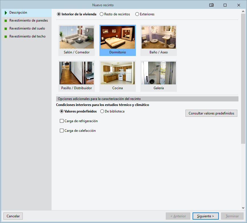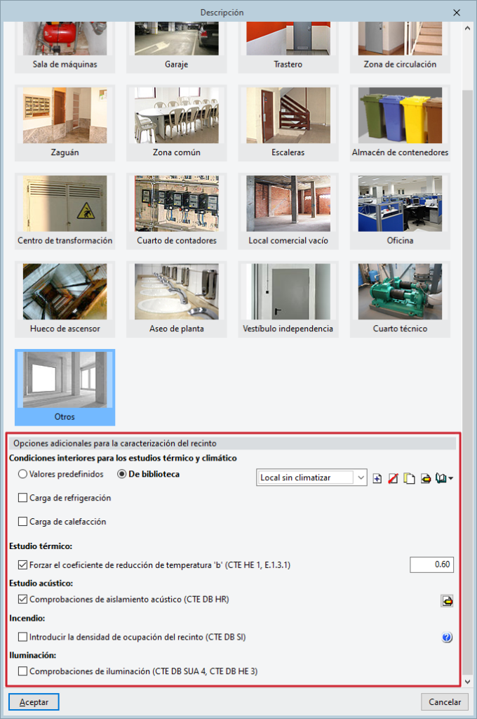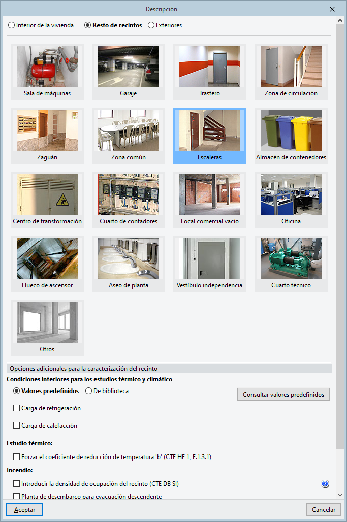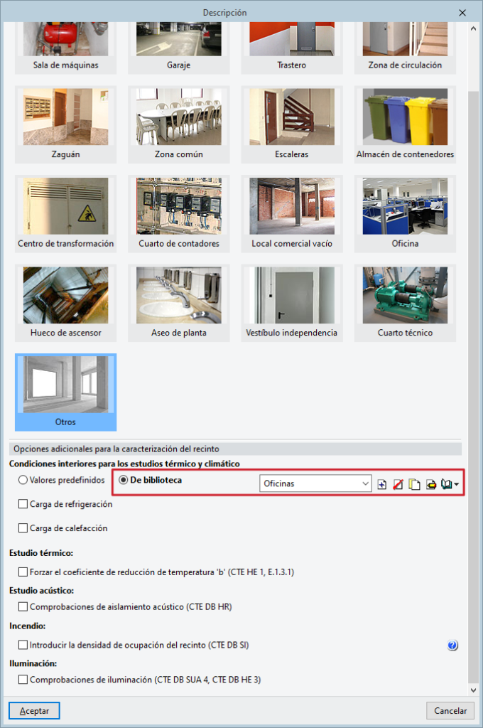En la parte superior, es posible seleccionar uno de los recintos predefinidos ofrecidos por el programa, que dependen del tipo de edificio seleccionado previamente en la creación de la obra, y que se puede consultar o modificar desde la opción "Tipo de edificio" de la pestaña "Obra". La selección de cualquiera de estos recintos predefinidos permite la caracterización del recinto a partir de los datos incorporados en el programa.