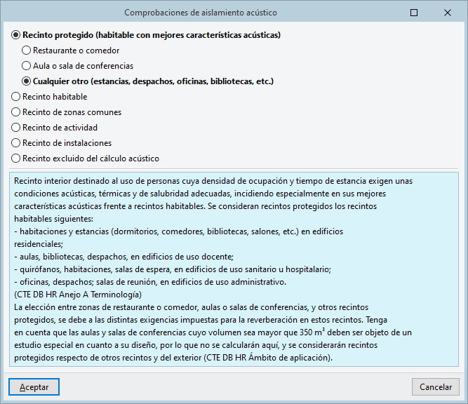 Permite seleccionar si el recinto es protegido, habitable, de zonas comunes, de actividad, de instalaciones o excluido del cálculo acústico.