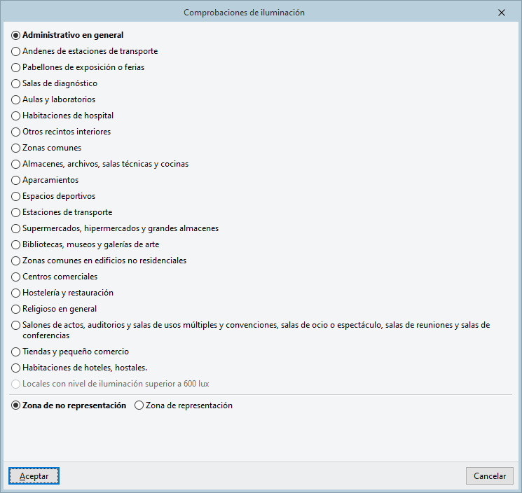 Permite categorizar el recinto a efectos de las comprobaciones de iluminación desarrolladas en las normas CTE DB SUA 4 y CTE DB HE 3.