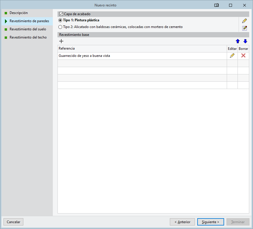 Permite definir las características y condiciones interiores del recinto a efectos de los diferentes cálculos realizados por el programa. - Revestimiento de paredes