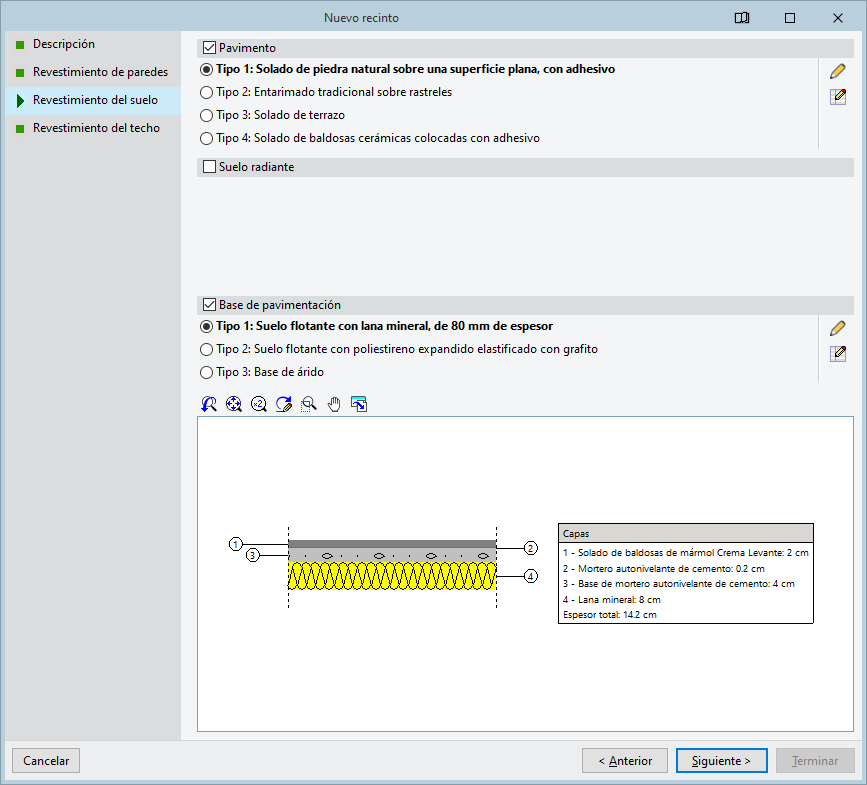 Permite definir el revestimiento de paredes del recinto. - Revestimiento del suelo