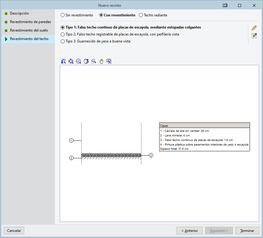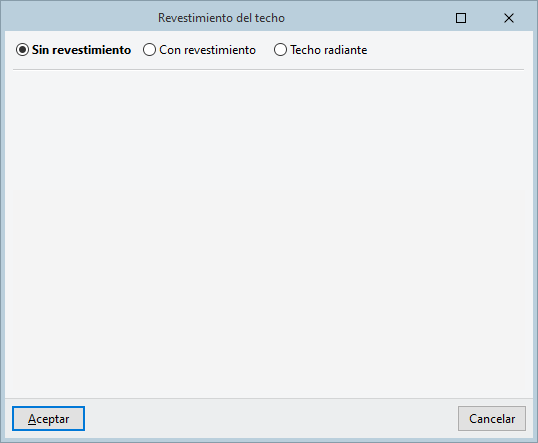 Esta opción permite indicar que se va a disponer una instalación de techo radiante en el recinto o parte del mismo, definiendo así la solución constructiva asociada en el revestimiento del techo. Posteriormente, se puede introducir dicha instalación desde las opciones correspondientes de la solapa "Climatización".