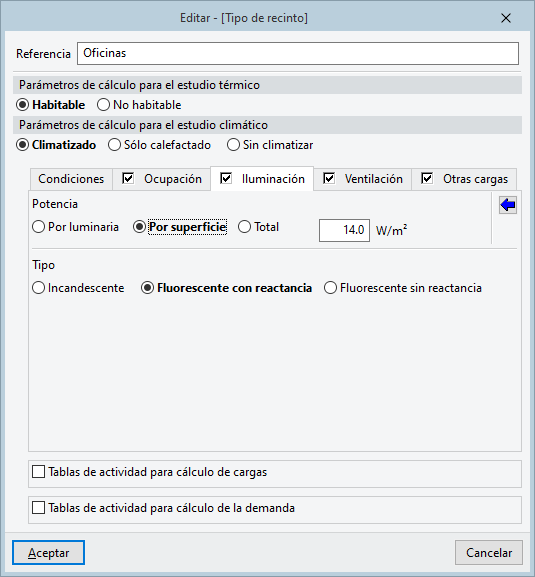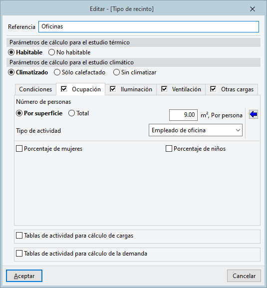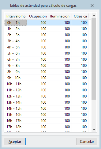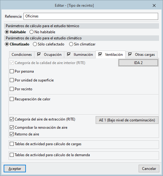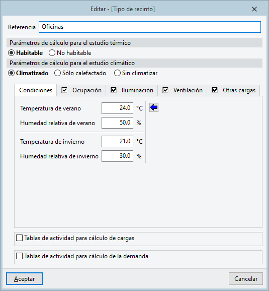 De esta forma, es posible editar directamente los datos que definen las condiciones interiores del recinto a efectos de estos estudios.