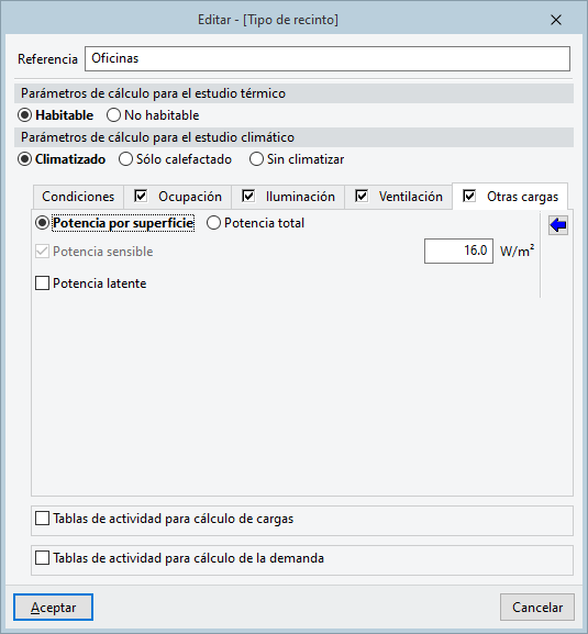 Permite editar los "Parámetros de cálculo para el estudio térmico" y los "Parámetros de cálculo para el estudio climático" del recinto. Para ello, se puede seleccionar uno de los recintos disponibles en el desplegable que aparece, o crear y editar un tipo de recinto manualmente. Estos tipos de recintos se pueden guardar, importar y exportar a ficheros en disco a través de un sistema de bibliotecas utilizando las opciones a la derecha. - Carga de refrigeración / Carga de calefacción (opcional)
