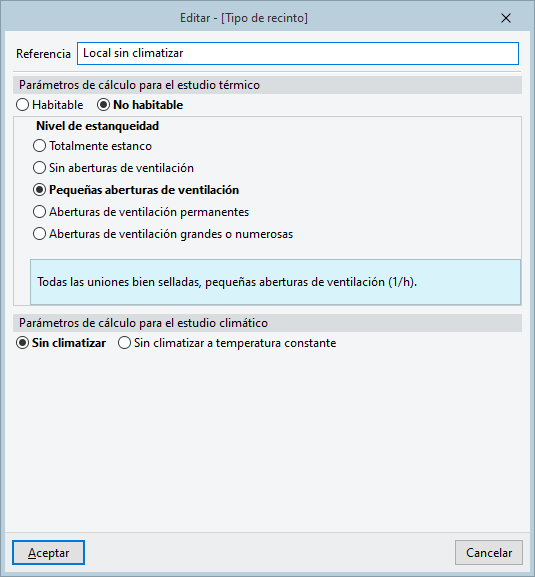 Permite modificar las características del recinto a efectos de los cálculos realizados en las solapas "Estudio térmico" y "Climatización".- Valores predefinidos