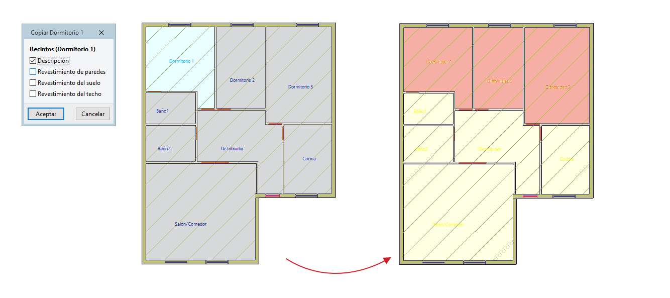 Al pulsar sobre la opción, se debe seleccionar el recinto del que se desea extraer la información. De esta forma, aparece la ventana donde se pueden seleccionar las características a copiar:
