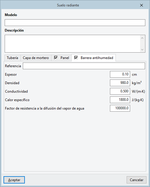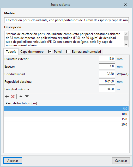 - Tubería de distribución entre paneles (Diámetro exterior, Espesor, Conductividad, Rugosidad absoluta) (en techos radiantes de tipo "Modular")