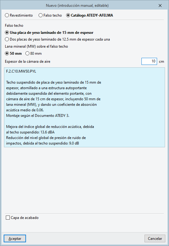 Es posible ajustar la selección definiendo el número de placas que componen el "Falso techo" e indicando el espesor de la "Lana mineral (MW) sobre el falso techo", así como el "Espesor de la cámara de aire".