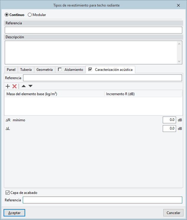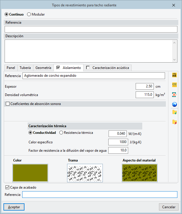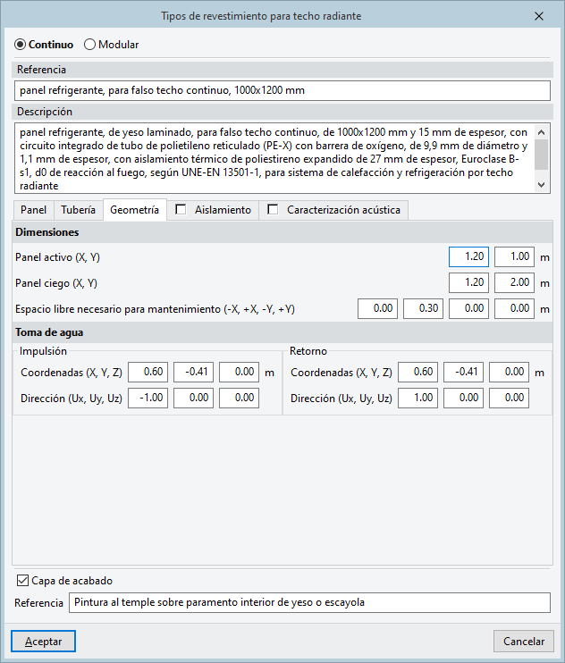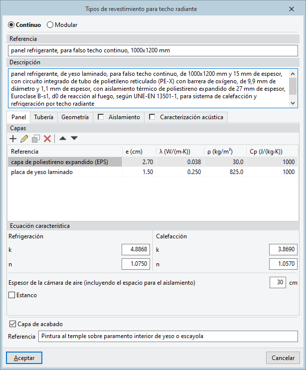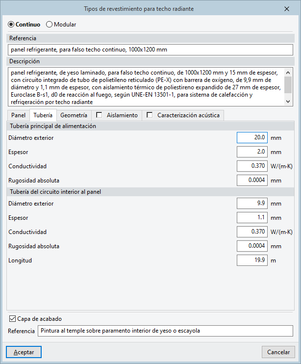 En este último caso, se puede definir el techo radiante mediante los siguientes parámetros, en función de si es "Continuo" o "Modular":