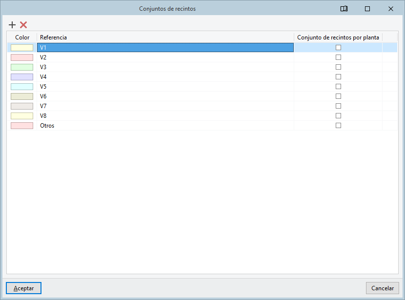 En la tabla, para cada conjunto de recintos se define el "Color" de representación en planta y la "Referencia" del conjunto. La activación de la casilla "Conjunto de recintos por planta" permite que el programa genere un conjunto de recintos diferente por cada planta en caso de que dicho conjunto se asigne a recintos que se encuentran en un grupo de más de una planta. La columna a la derecha indica si el conjunto se encuentra en uso o no.