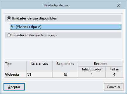 Permite asignar unidades de uso a recintos. Para que la opción se encuentre activa, es necesario haber introducido recintos en el modelo.