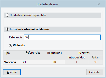 Esta opción permite introducir otra unidad de uso nueva. Al igual que en la introducción de la primera unidad de uso, se escribe la "Referencia" y se selecciona el tipo de unidad de uso. Posteriormente, tras "Aceptar" el panel, se seleccionan en el área de trabajo con el botón izquierdo los recintos que se desean asignar a dicha unidad.