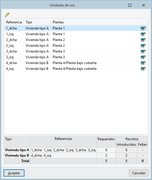 Muestra una tabla con las unidades de uso introducidas y asignadas a recintos en el modelo. Para cada unidad de uso se indica su "Referencia", el "Tipo" y las "Plantas" donde se encuentran los recintos asignados.