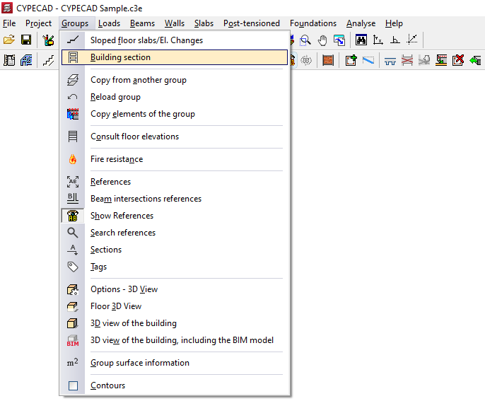 La opción "Sección del edificio" del menú "Grupos", dentro de la pestaña "Entrada de vigas", permite generar secciones del edificio mediante la realización de cortes verticales del modelo completo de la estructura.