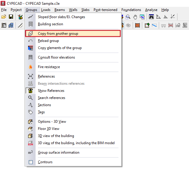 La opción "Copiar de otro grupo" del menú "Grupos", dentro de la pestaña "Entrada de vigas", permite copiar todos los datos del grupo de plantas que se seleccione sobre el grupo en el que se esté situado en este momento.