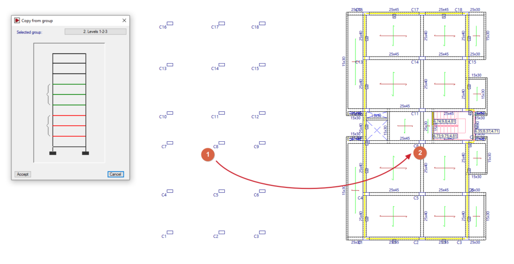 - Pulsar sobre la opción "Copiar de otro grupo". El programa abrirá una ventana emergente donde se observa un esquema con los grupos de plantas de la obra. Se puede ver en verde el grupo de destino y, al pasar el puntero, se ilumina en rojo el grupo sobre el que se desea copiar.