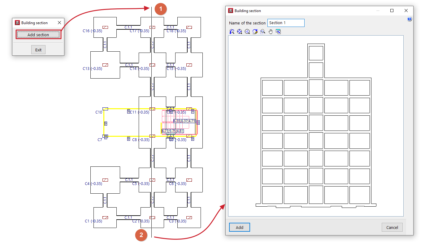 Para ello, tras pulsar sobre la opción, aparece un menú con la herramienta "Añadir sección". Tras seleccionarla, se deben marcar dos puntos en planta que definan la dirección y orientación de la sección. El programa mostrará en pantalla una visualización de la sección, y permitirá escribir el "Nombre de la sección".