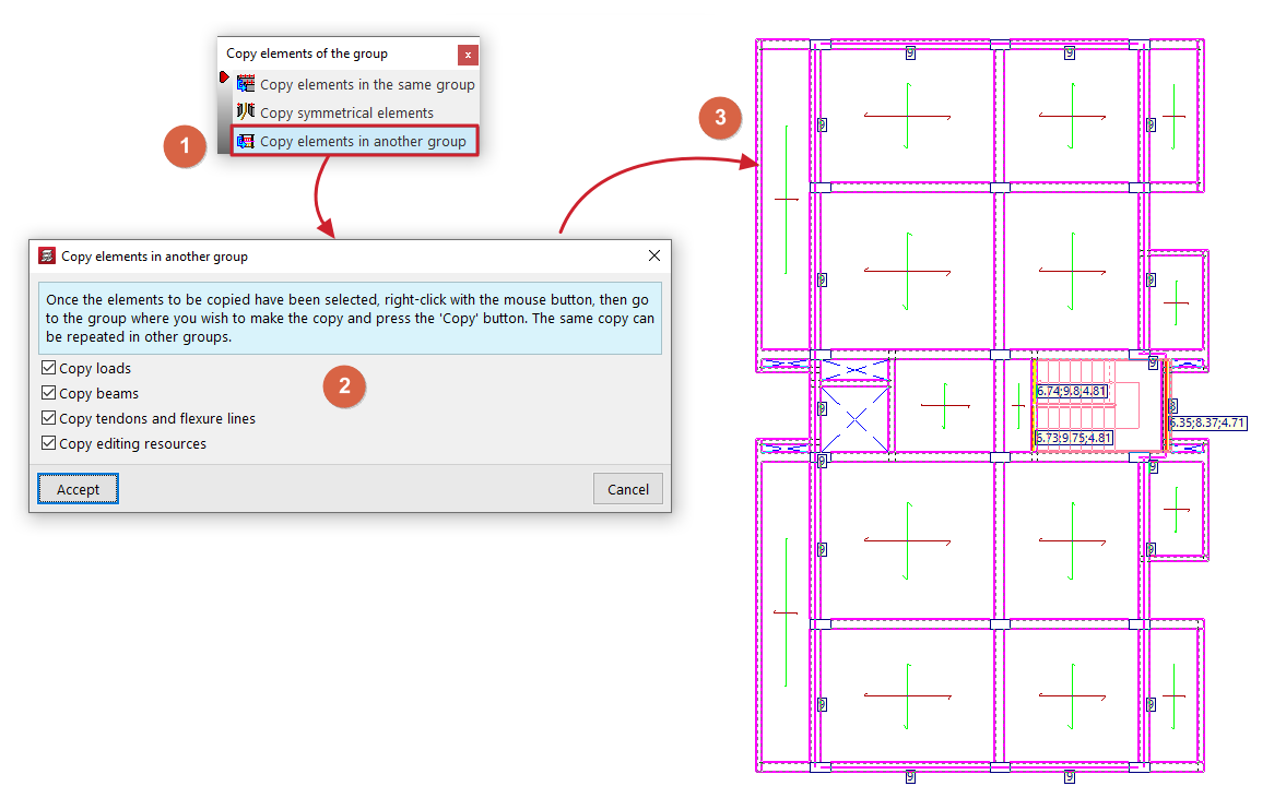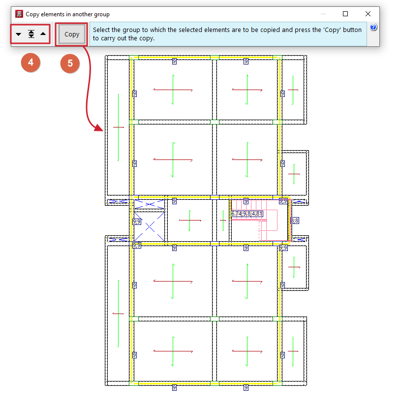 La opción "Copiar elementos del grupo" del menú "Grupos", dentro de la pestaña "Entrada de vigas", permite copiar elementos seleccionados de un grupo de plantas en el mismo grupo o en otros grupos.