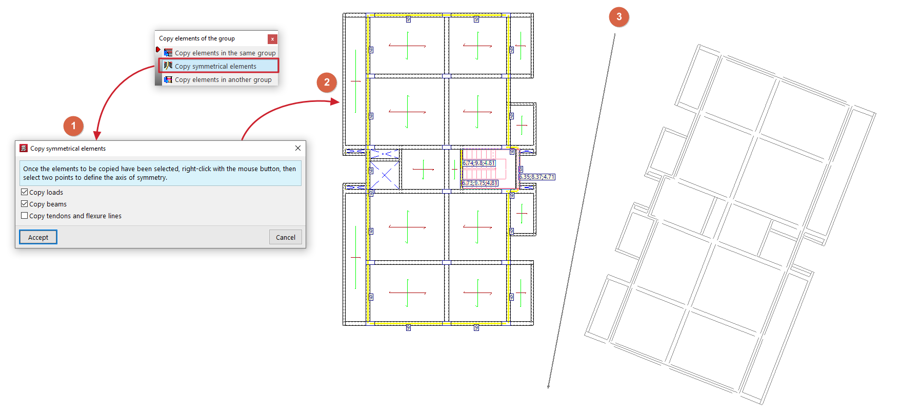 Al finalizar la selección, se pulsa el botón derecho. - Ahora, será necesario marcar dos puntos en planta con el botón izquierdo que definan el eje de simetría de la copia. De esta forma, los elementos se copiarán en una nueva posición definida por esta operación de simetría.