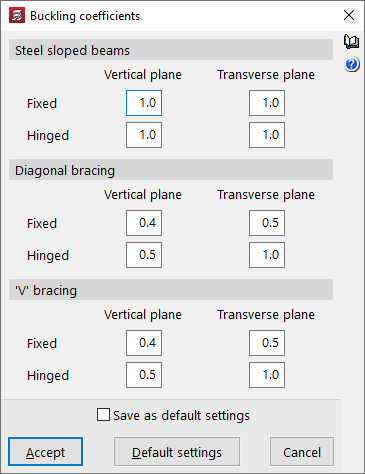 Permite ajustar los coeficientes de pandeo en ambos planos ("Plano vertical" y "Plano transversal") de los siguientes elementos: