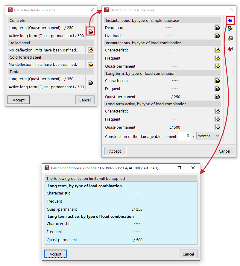 En algunos casos, el asistente de la parte superior derecha permite importar los valores de los límites de flecha a partir de las "Condiciones de diseño" de las normativas seleccionadas en los "Datos generales".