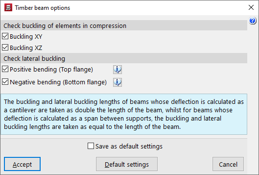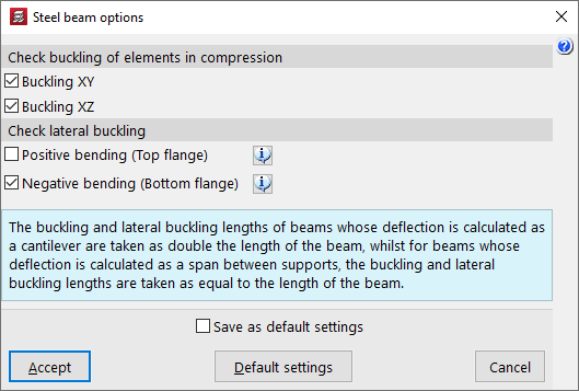 | En las vigas cuya flecha se calcula como voladizo, se consideran longitudes de pandeo y de pandeo lateral iguales al doble de la longitud de la viga. Por otro lado, en las vigas cuya flecha se calcula como vano entre apoyos, las longitudes de pandeo y de pandeo lateral se toman iguales a la longitud de la viga. |
