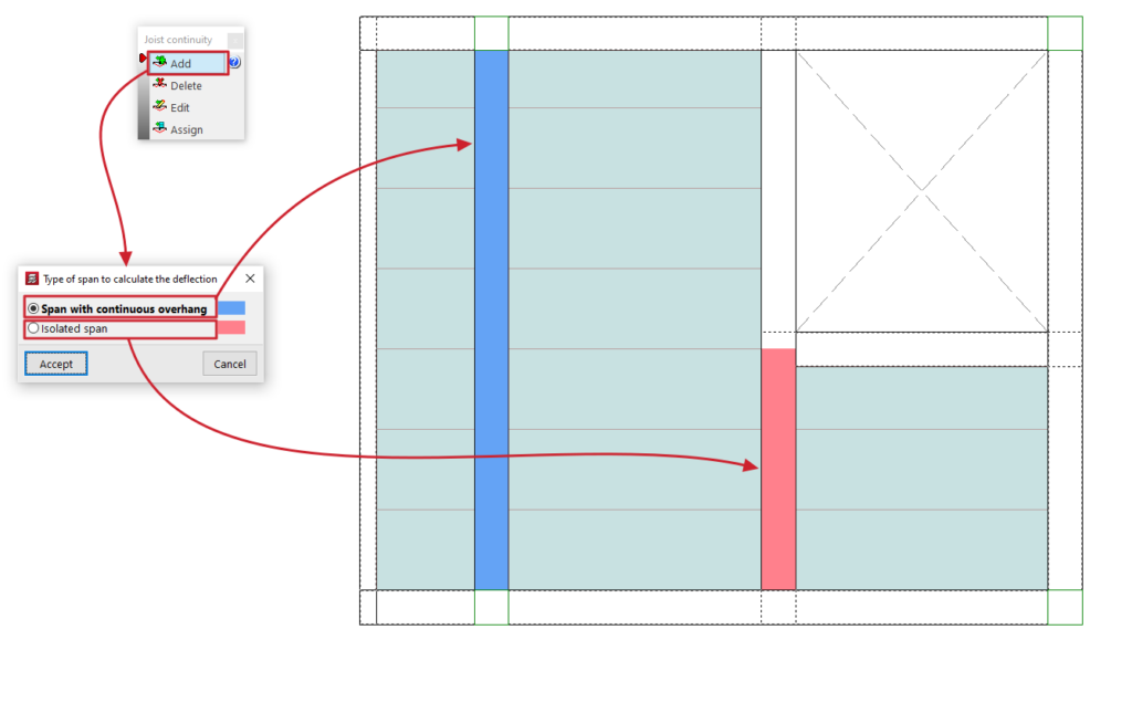 Permite seleccionar dos vanos interiores para que se considere la continuidad de las viguetas en ellos como si se tratara de un único vano aislado.