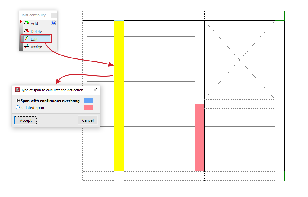 Permite seleccionar una de las vigas situadas entre dos paños en los que se ha aplicado una condición de continuidad de viguetas para modificarla.