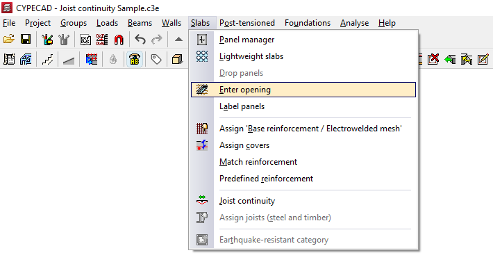 CYPECAD - Opciones del menú "Paños" en la pestaña "Entrada de vigas"