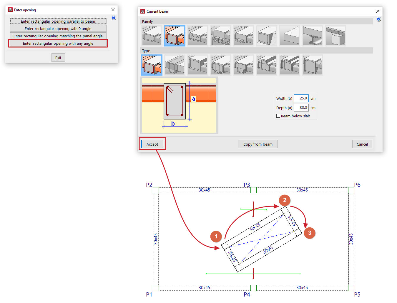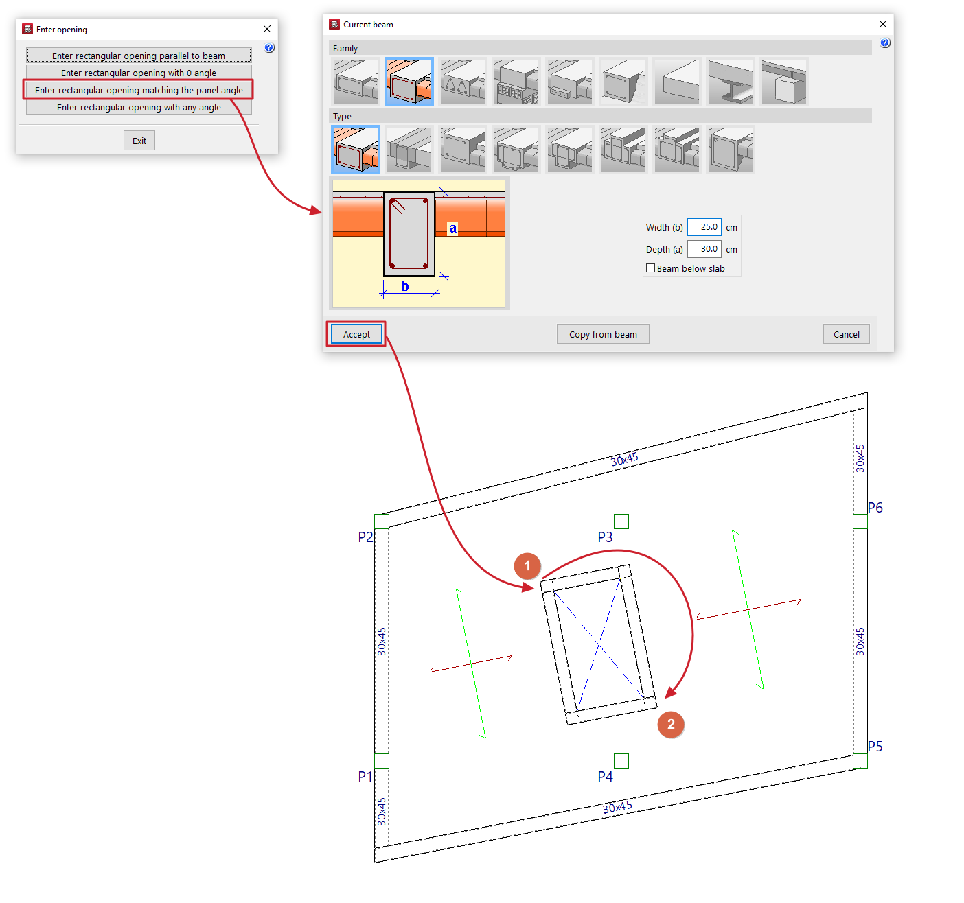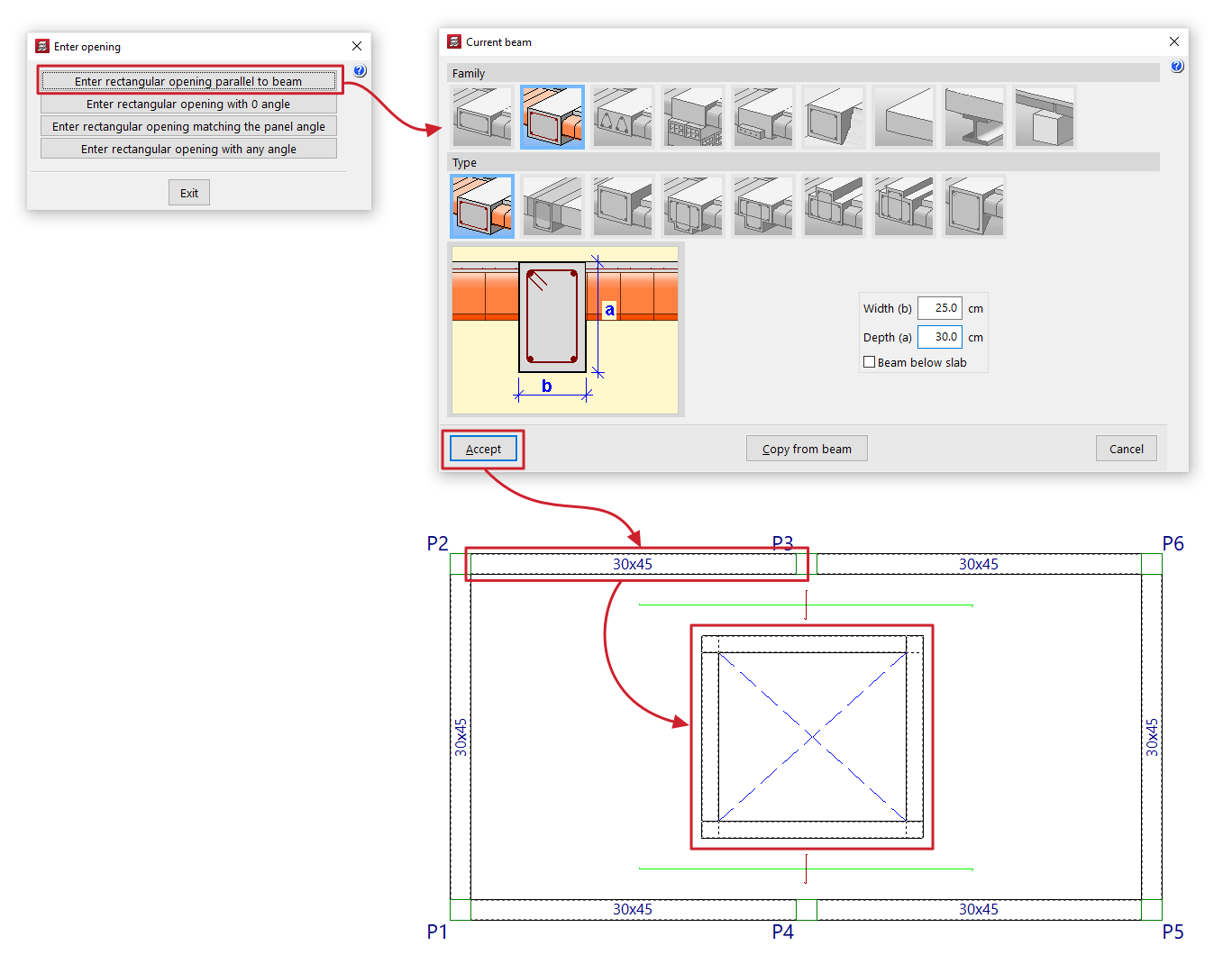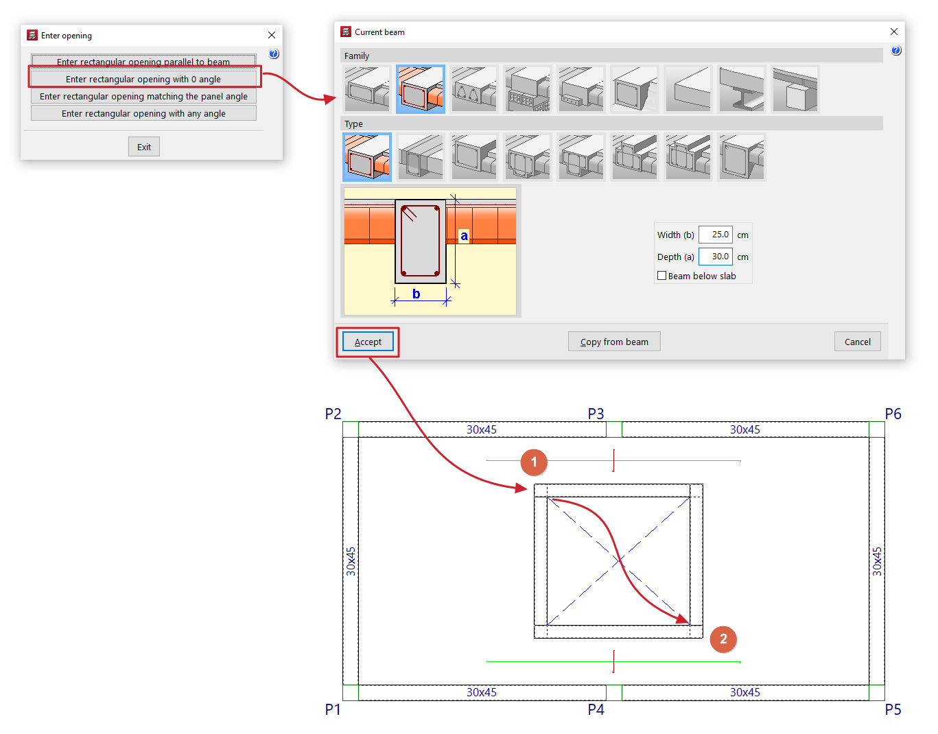Después, el usuario debe marcar una viga ya existente, a la cual serán paralelas y ortogonales las vigas del hueco rectangular generado. Por último, se deben marcar dos puntos en planta, que formarán una de las diagonales del hueco.