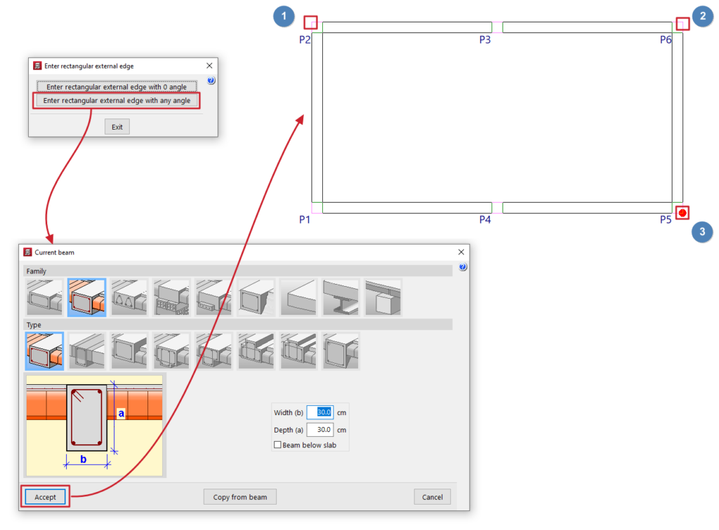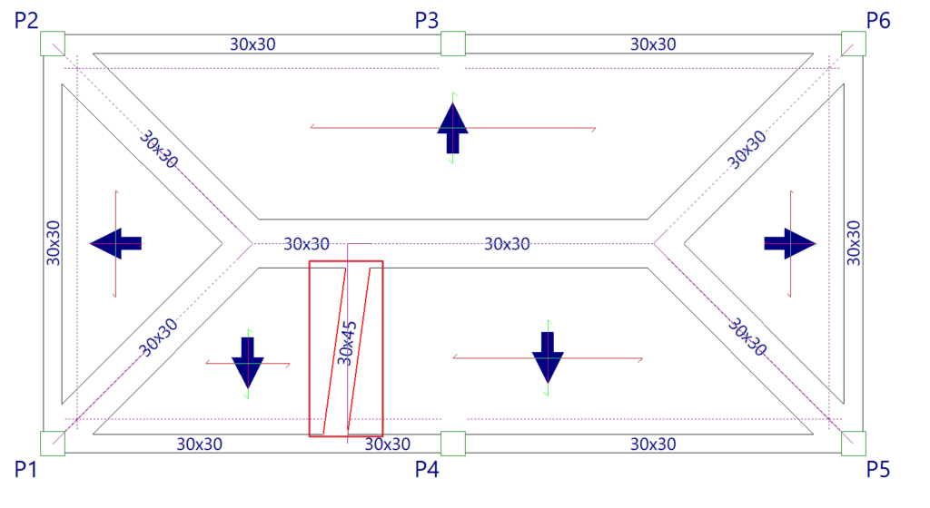 Después, se deben marcar dos puntos en planta (1 y 2), que formará una de las diagonales del borde. Las vigas tomarán las direcciones de los ejes principales de coordenadas.