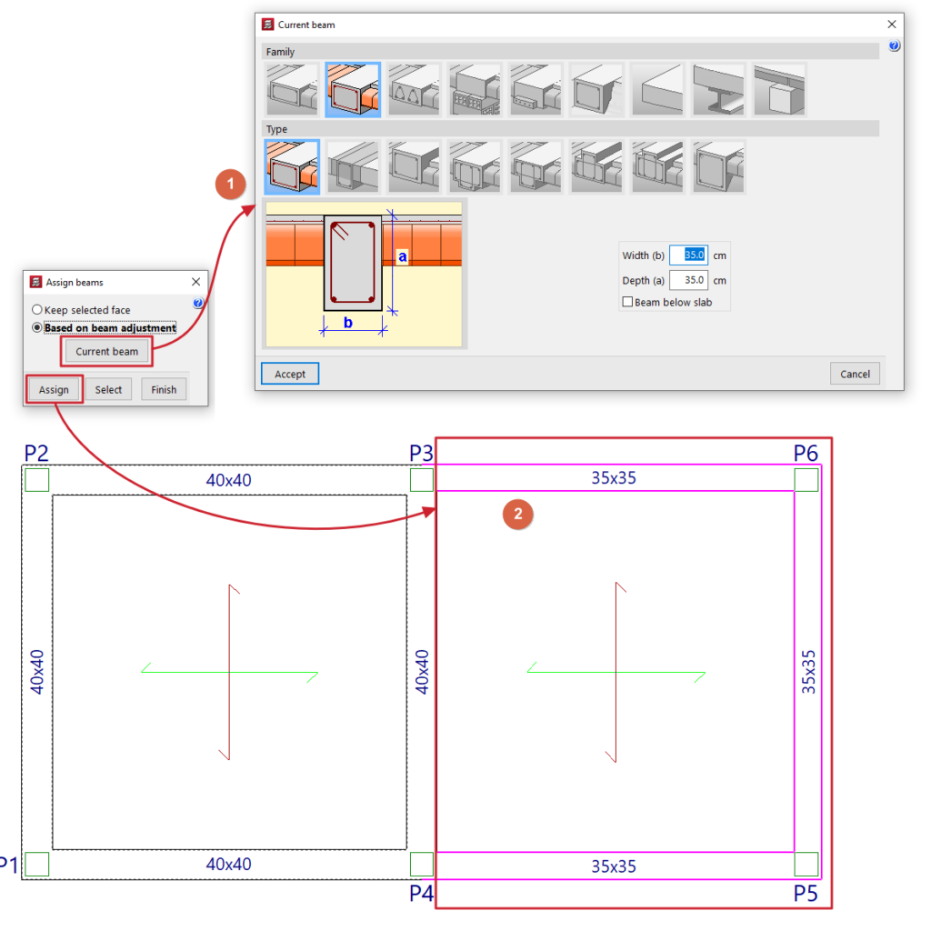 La opción "Asignar vigas" permite copiar las características de la última viga introducida (o viga actual) a tramos de vigas ya introducidos en el modelo mediante su selección en planta. De esta forma, se pueden cambiar los datos de vigas existentes sin necesidad de eliminarlas y reintroducirlas.