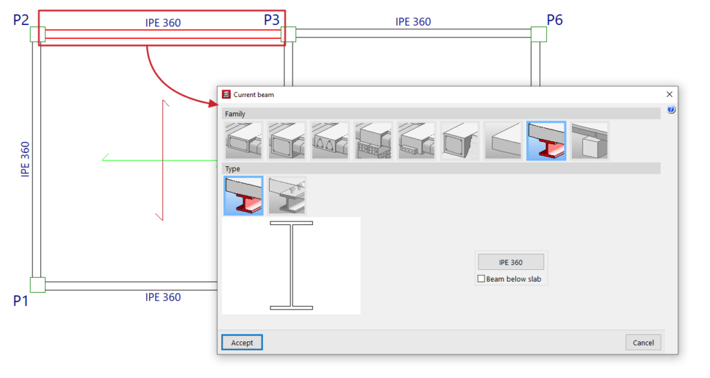 A esta ventana se puede acceder posteriormente pulsando sobre la primera opción del cuadro de diálogo que aparece mientras se introduce la viga, "Selección de la viga actual".
