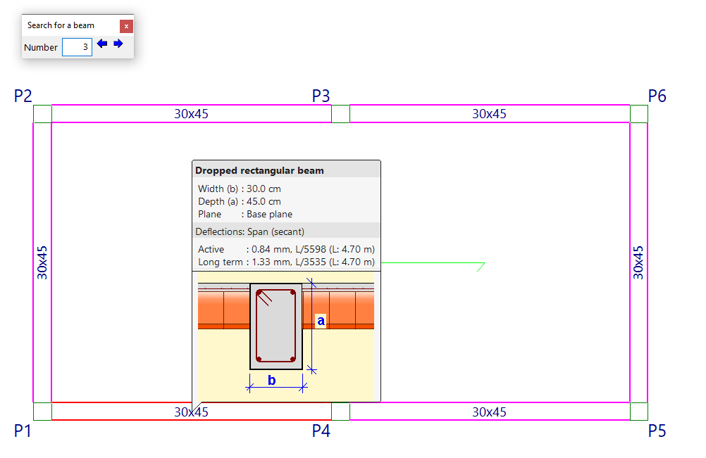 Para ello, se selecciona con el puntero del ratón la viga, o se escribe su "Número" en el campo correspondiente del cuadro de diálogo "Buscar una viga" que aparece y se pulsa 'Intro'. Al hacerlo, la viga se marcará en rojo y el resto de vigas que sean iguales a la viga seleccionada se marcarán en color magenta.