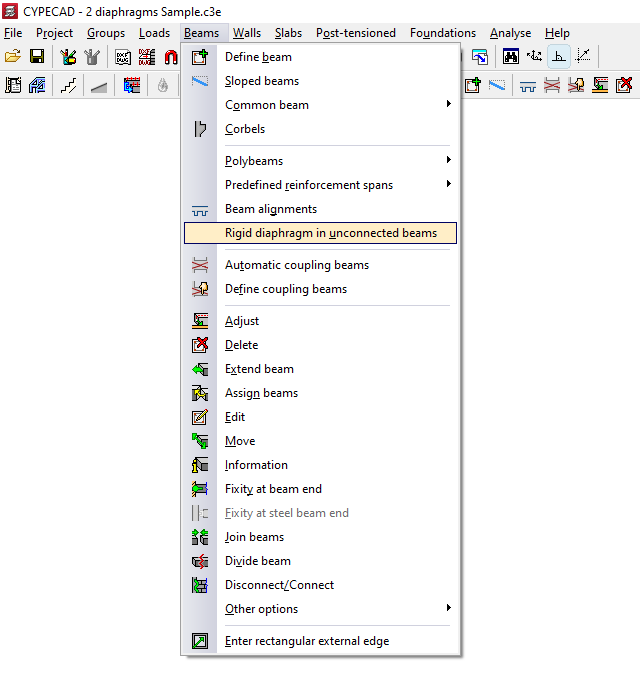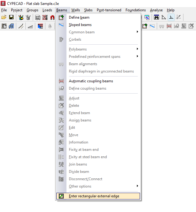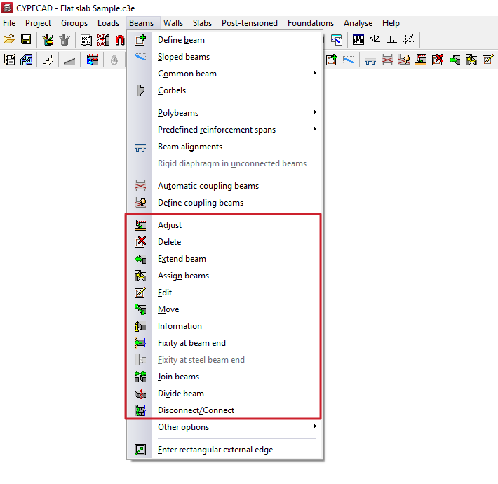 CYPECAD - Opciones del menú "Vigas" en la pestaña "Entrada de vigas"