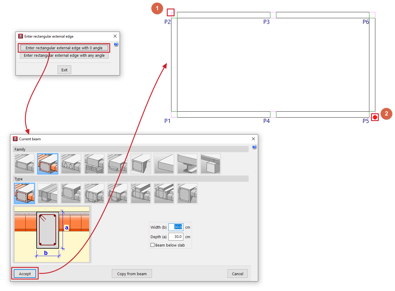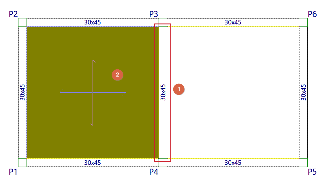 Después, se deben marcar dos puntos en planta (1 y 2), que formará una de las diagonales del borde. Las vigas tomarán las direcciones de los ejes principales de coordenadas.
