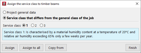 La opción "Asignar clase de servicio" permite asignar la clase de servicio a las vigas de madera, ya sea seleccionando la clase definida en los "Datos generales de la obra" (dentro del menú "Obra > Datos generales") o indicando una "Clase de servicio diferente a la general de la obra".
