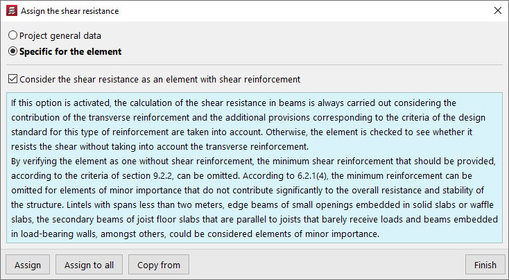 La opción "Asignar la resistencia a cortante" permite ajustar el cálculo de la resistencia a cortante en vigas, ya sea utilizando la configuración definida en los "Datos generales de la obra" (dentro del menú "Obra > Datos generales > Por posición > Opciones de vigas > Dimensionamiento/Comprobación") o seleccionando un ajuste "Específico para el elemento".