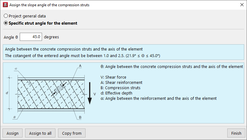 La opción "Asignar el ángulo de inclinación de las bielas de compresión" permite modificar el ángulo de las bielas de compresión con el eje de cada pieza.