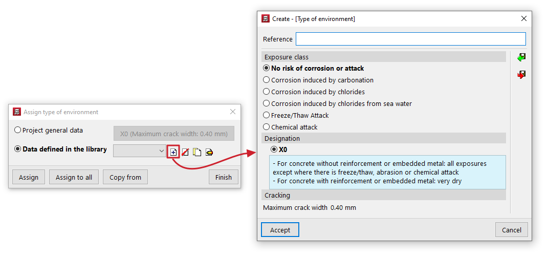 En este último caso, se crea el tipo de ambiente indicando una "Referencia", y seleccionando la "Clase de exposición" y su "Designación", con lo que se obtiene un valor de "Abertura máxima de fisura".