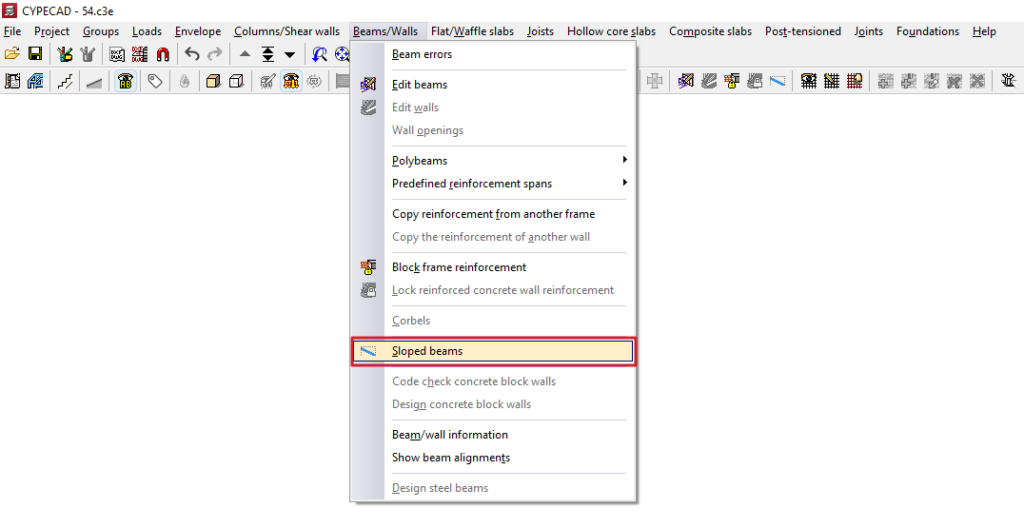 Al pulsar sobre esta opción, se abre la ventana "Vigas inclinadas", que incluye un menú con las siguientes herramientas: