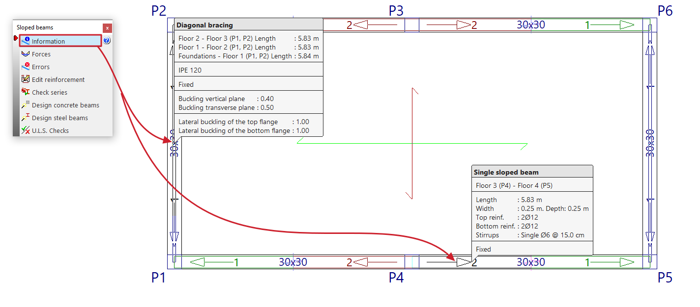 Pulsando el botón "Información" se obtiene información en pantalla sobre las vigas inclinadas, las diagonales de arriostramiento o los arriostramientos en V ya introducidos. Para ello, se selecciona en planta el elemento a consultar con el botón izquierdo o se escribe el número de elemento correspondiente.